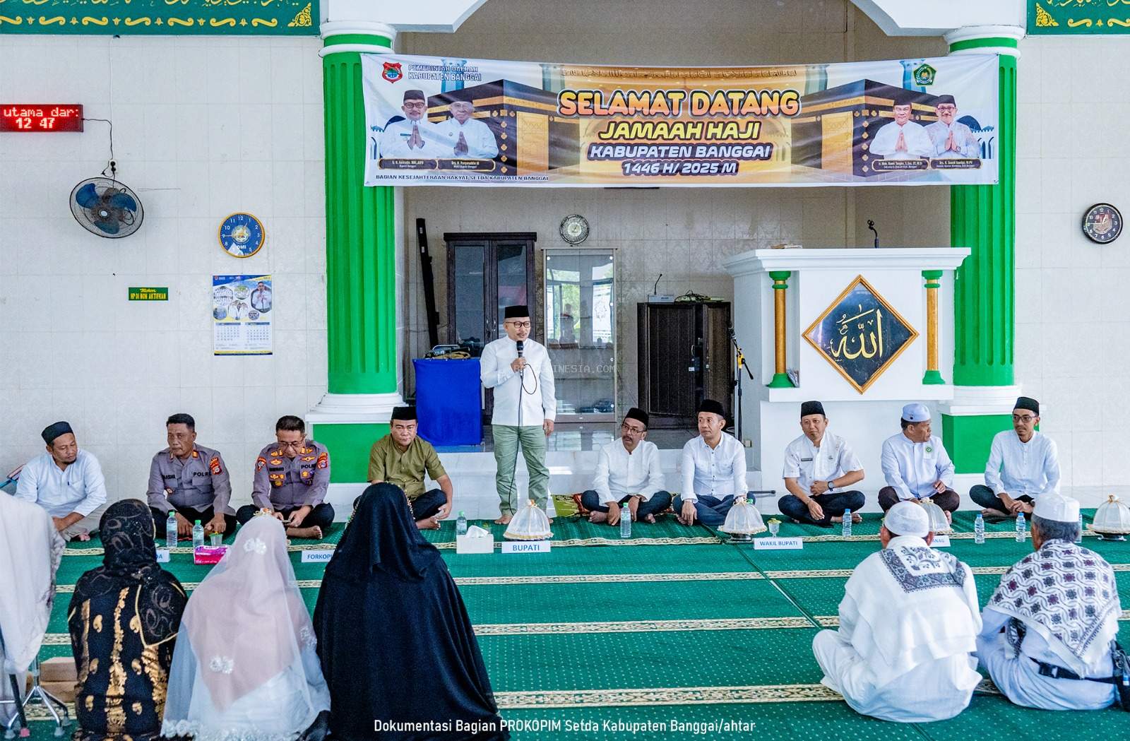 LUWUK - Bupati Banggai Ir. H. Amirudin, M.M. menerima secara resmi rombongan Jamaah Haji asal Kabupaten Banggai di Masjid Baitul Ma'muun Bukit Halimun Luwuk, Sabtu (05/07/2025).