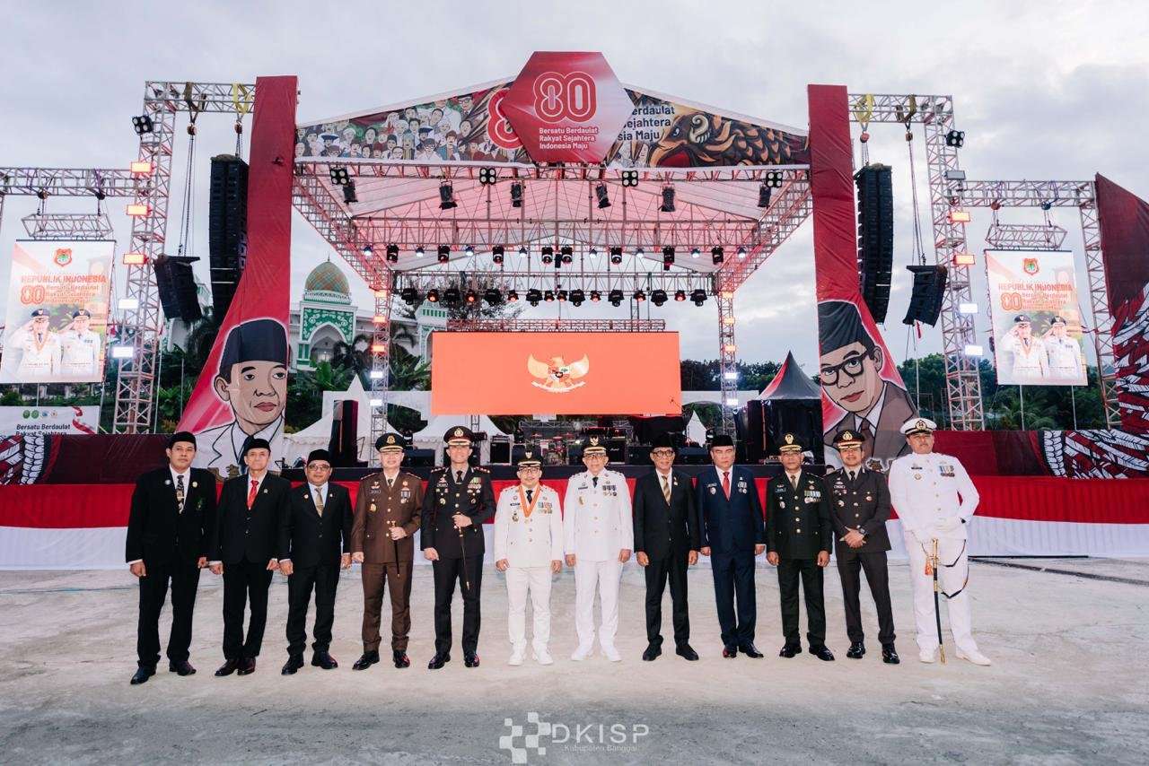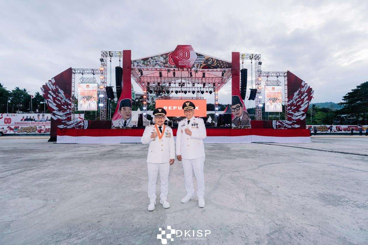 Bupati dan Wakil Bupati Banggai berpose di depan panggung utama usai upacara penurunan bendera HUT ke-80 RI