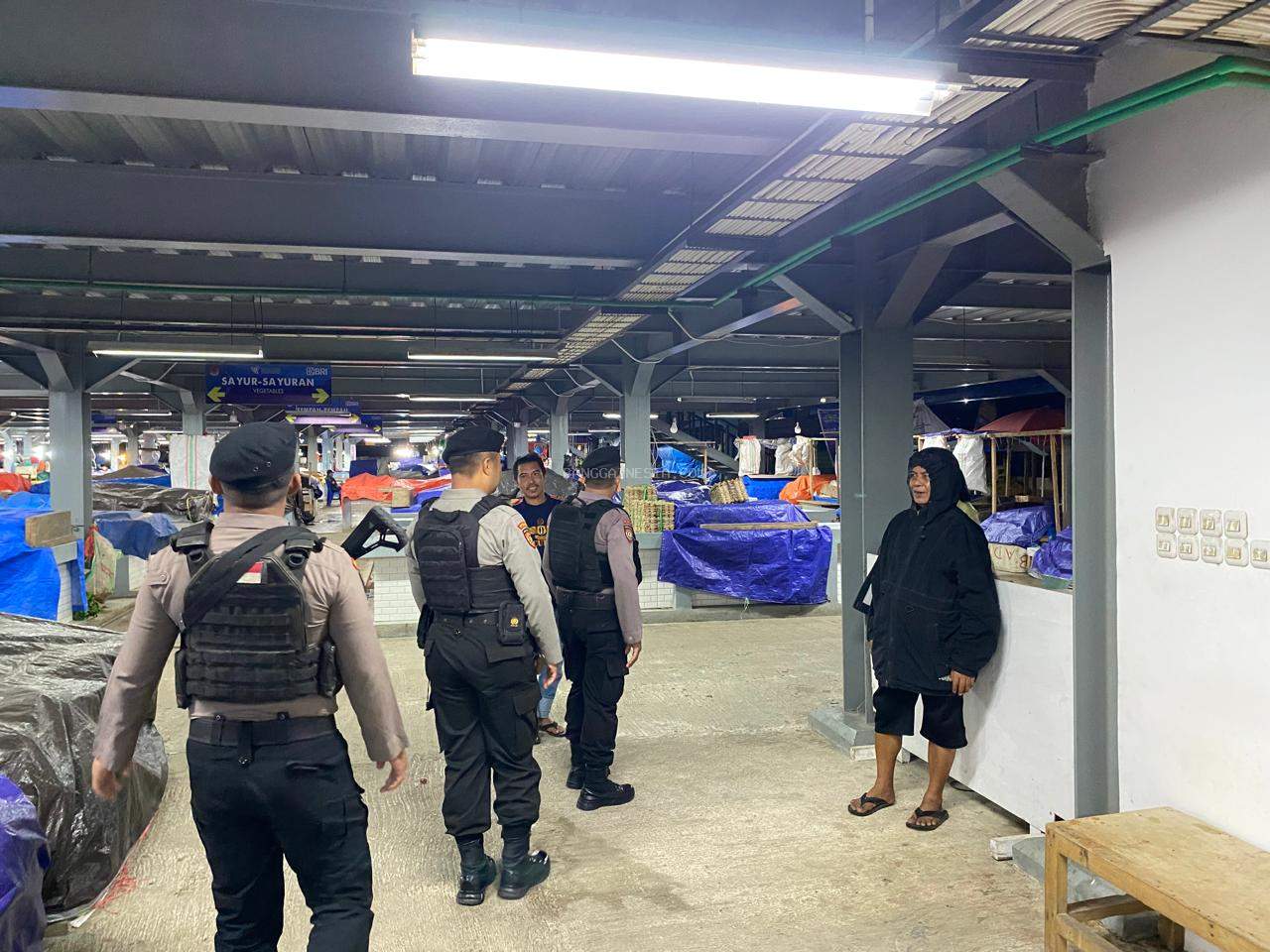 Personil Sat Samapta Polres Banggai, terlihat sedang berjalan kaki menyusuri lorong dan blok yang ada di dalam Pasar. Sesekali anggota tersebut berhenti di lapak pedagang untuk berdialog dengan warga masyarakat.