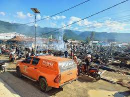 LUWUK - Tim Inafis Polres Banggai melakukan olah tempat kejadian perkara (TKP) setelah api dipastikan padam dan proses pendinginan selesai, Senin (12/5/2025). Kehadiran Inafis bertujuan untuk menyelidiki penyebab kebakaran yang melanda pasar tersebut.